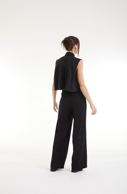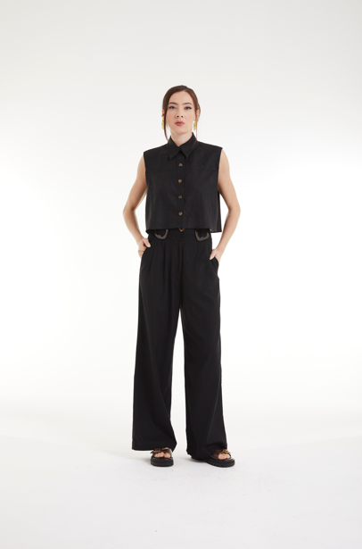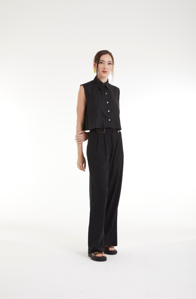 Seu design de cintura alta e modelagem ampla alonga a silhueta, enquanto os pregueados frontais trazem sofisticação à peça. O grande destaque é o cinto embutido com fivela de resina tartaruga, que valoriza a cintura e adiciona personalidade ao look.