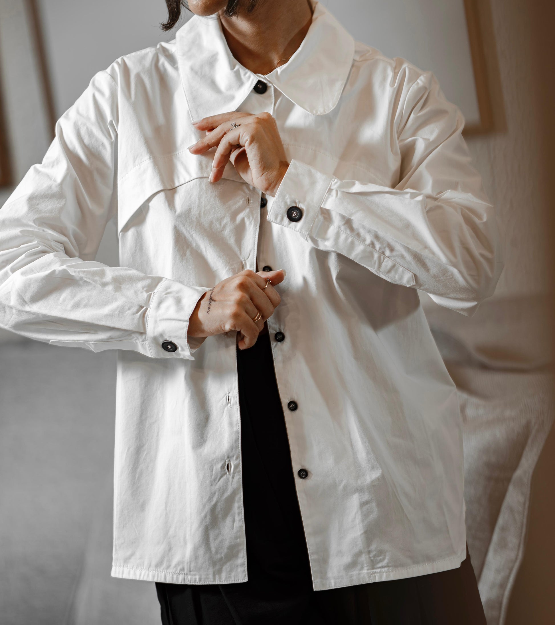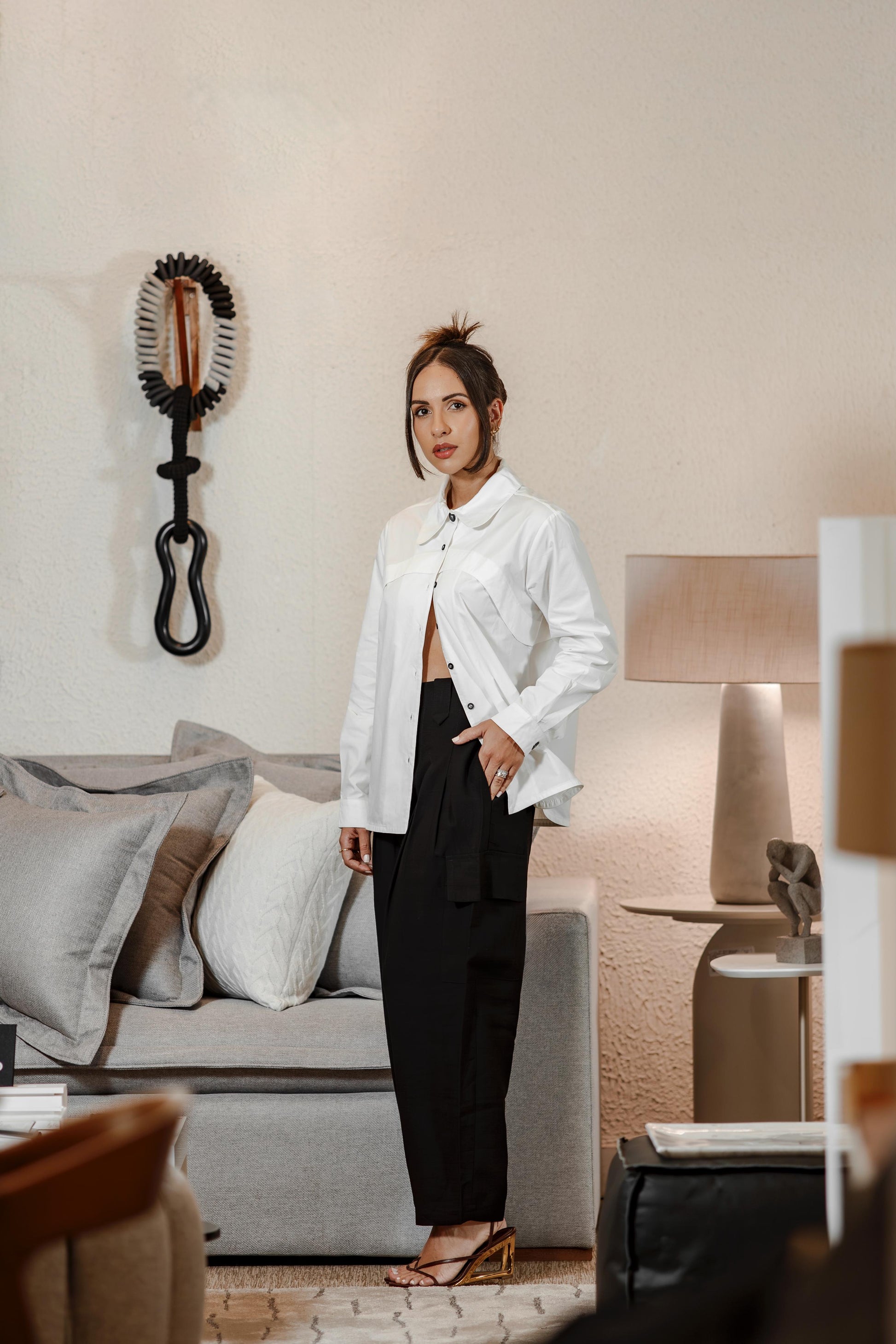 A Camisa Isis é a tradução da sofisticação com personalidade. Com modelagem alongada, ela traz um design exclusivo que valoriza a silhueta: a lapela com linhas curvas envolve delicadamente o busto, assim como a gola curva, que suaviza o visual e adiciona feminilidade à peça. Os botões pretos criam um contraste elegante, destacando cada detalhe, enquanto os punhos com recorte característico da AMIYA reforçam o DNA autoral da marca.