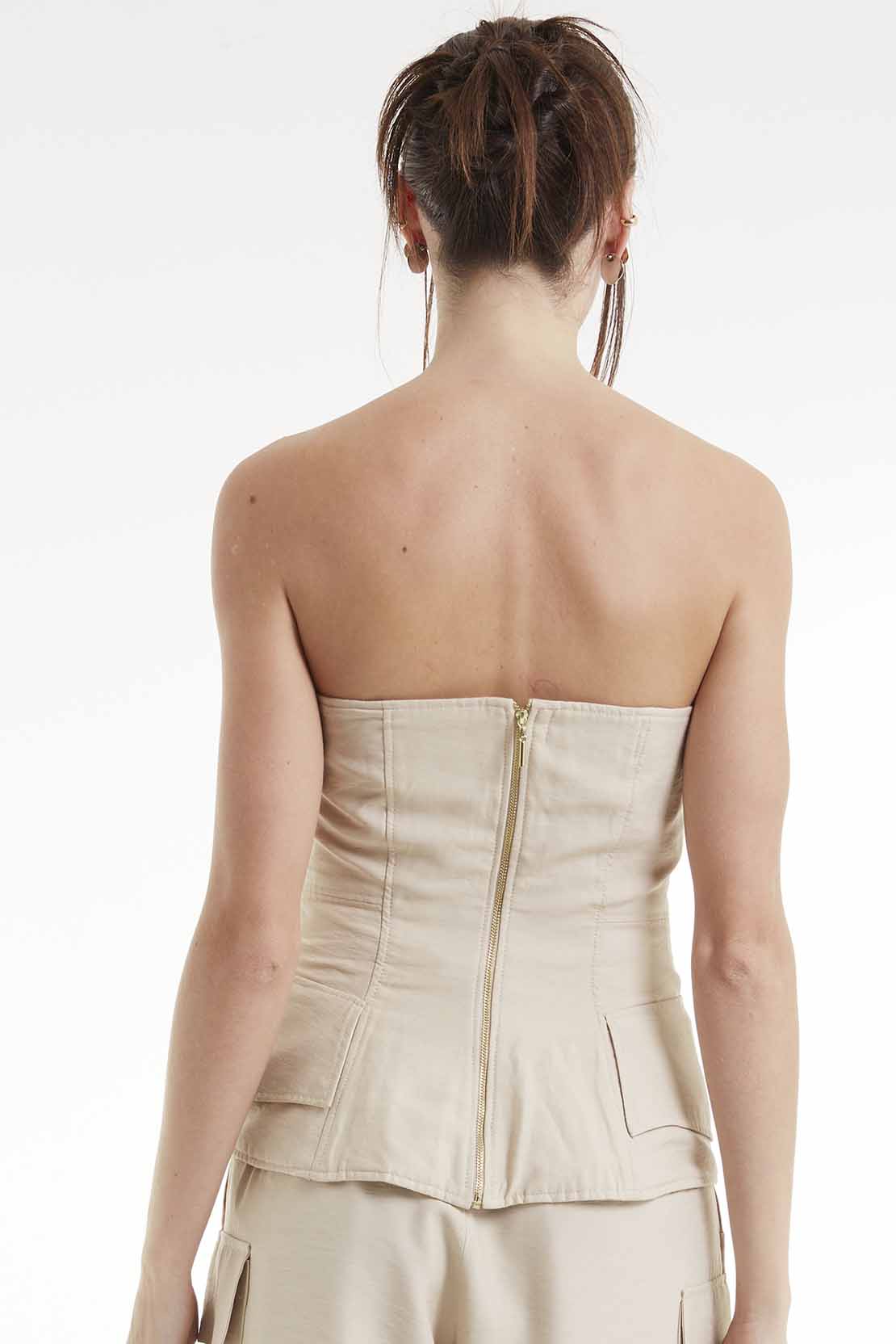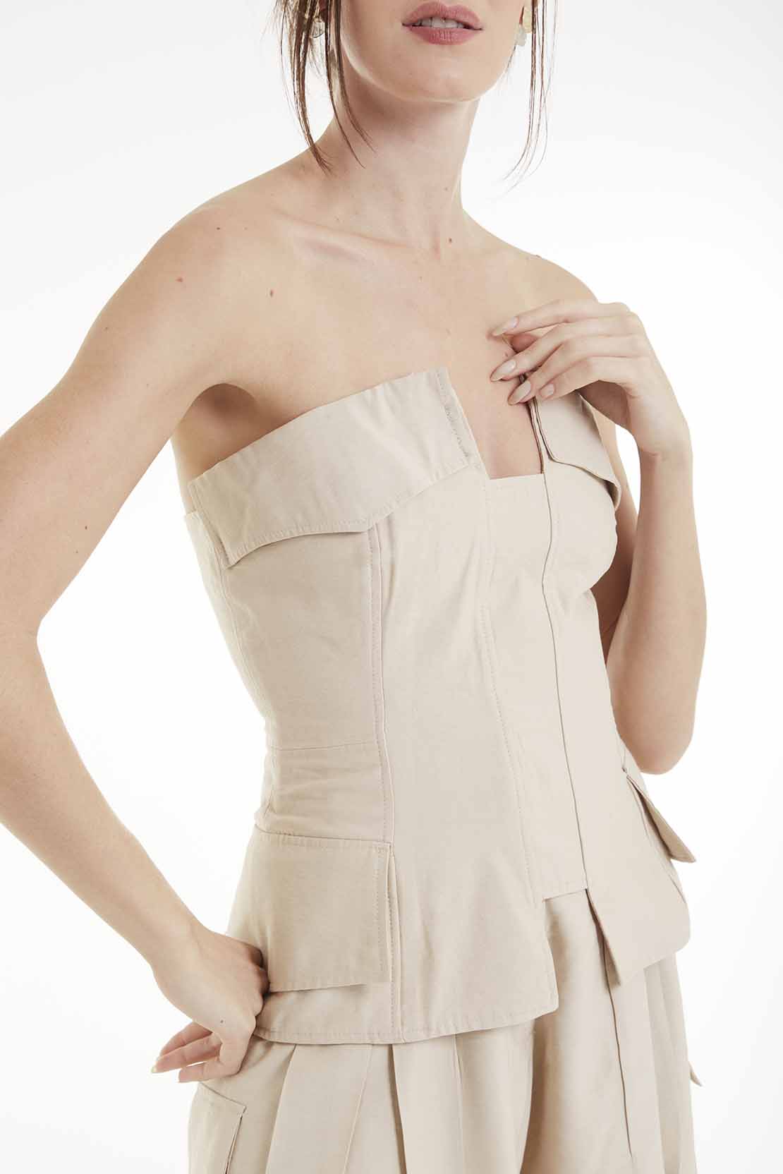 O Top Otavia combina estrutura e sofisticação em um design que valoriza as formas. Com barbatanas internas que garantem sustentação e dois bolsos utilitários que criam volume e personalidade, ele é confeccionado em tecido encorpado e finalizado com zíper metálico inteiro nas costas, funcional e cheio de estilo. A cor Bege traz a elegância neutra e atemporal do DNA da Amiya, enquanto a modelagem completa entrega um encaixe impecável ao corpo.